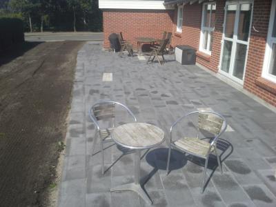 Flot terrasse med fliser og chaussesten anlagt af ASM Anlæg i Varde